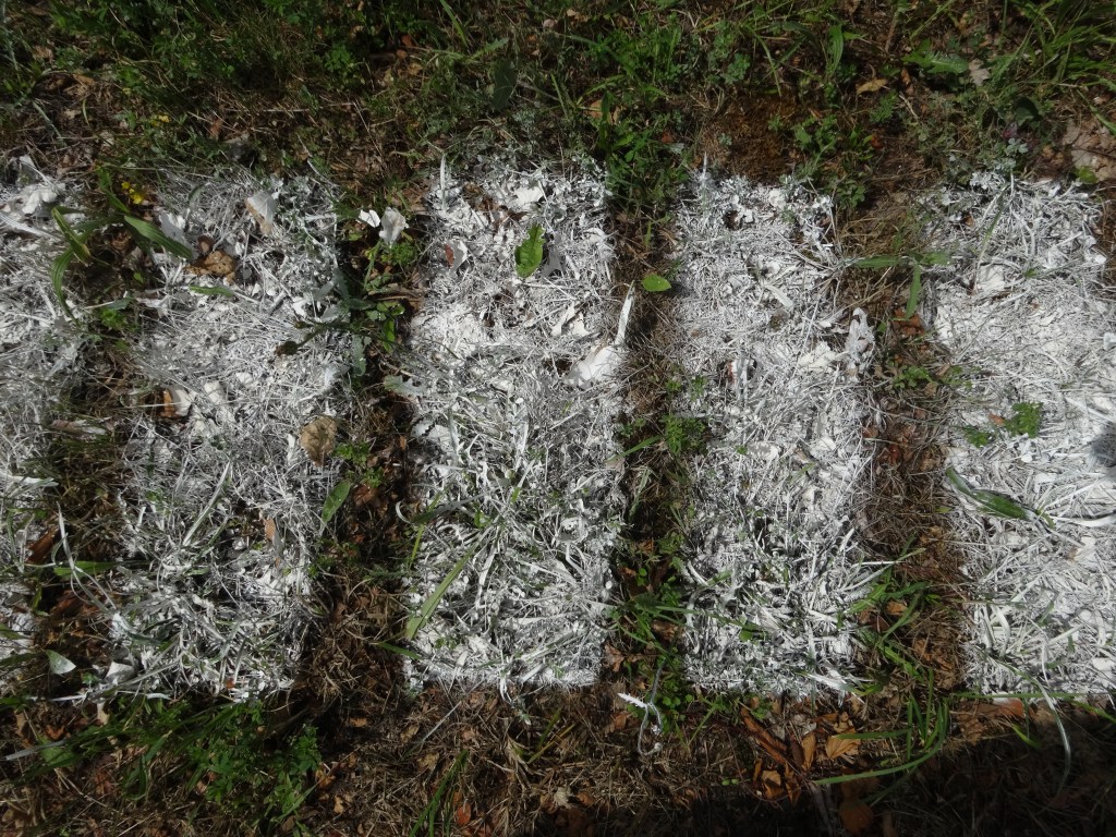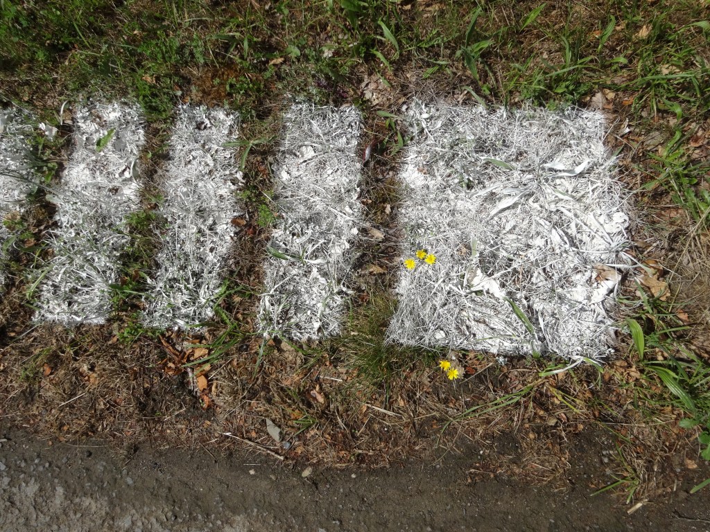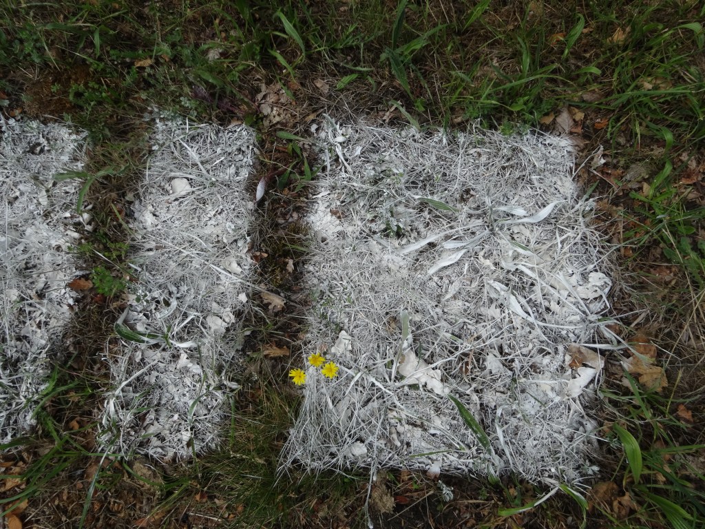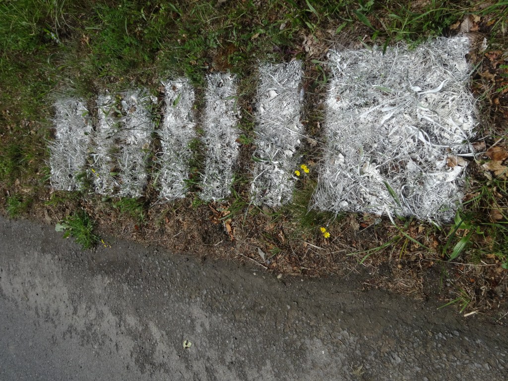 Signalisations routières déportées depuis la route vers son bas-côté herbeux. Les voitures sont libres. Les fourmis, lombrics et autres scarabées doivent respecter le code, avancer dans les clous © Chantal Deltenre