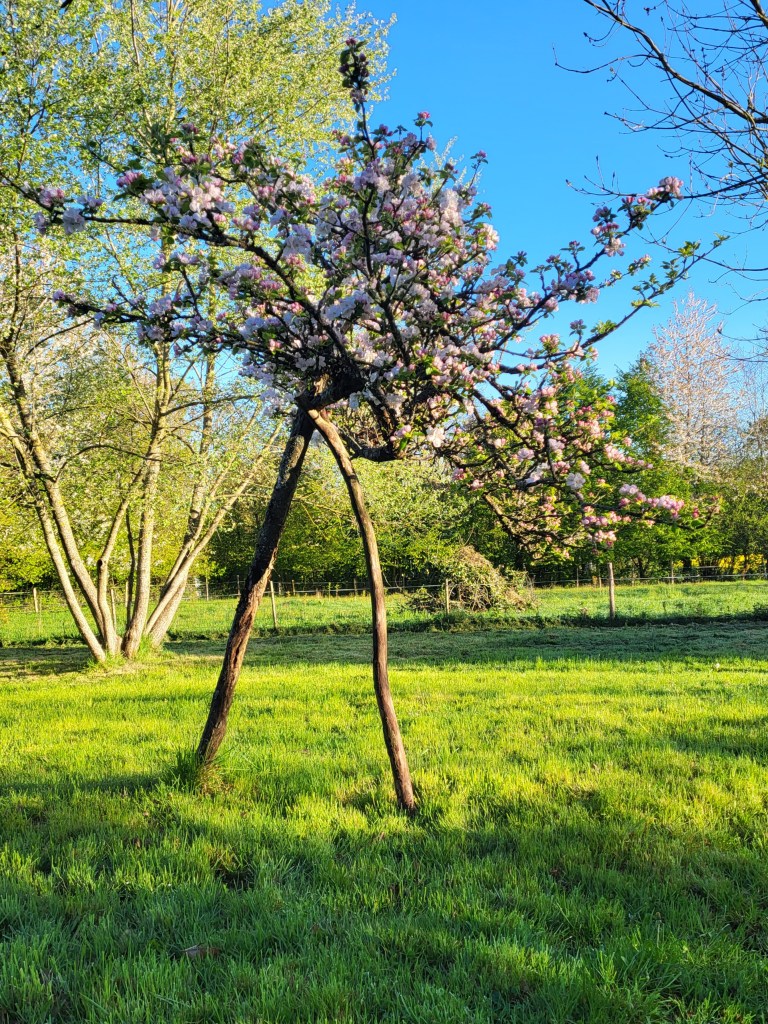 Surchargé de fleurs, bientôt de fruits, le pommier fragile menace de tomber. L’étais suffira-t-il à contenir le don disproportionné de sa floraison ? (Normandie, 2025)