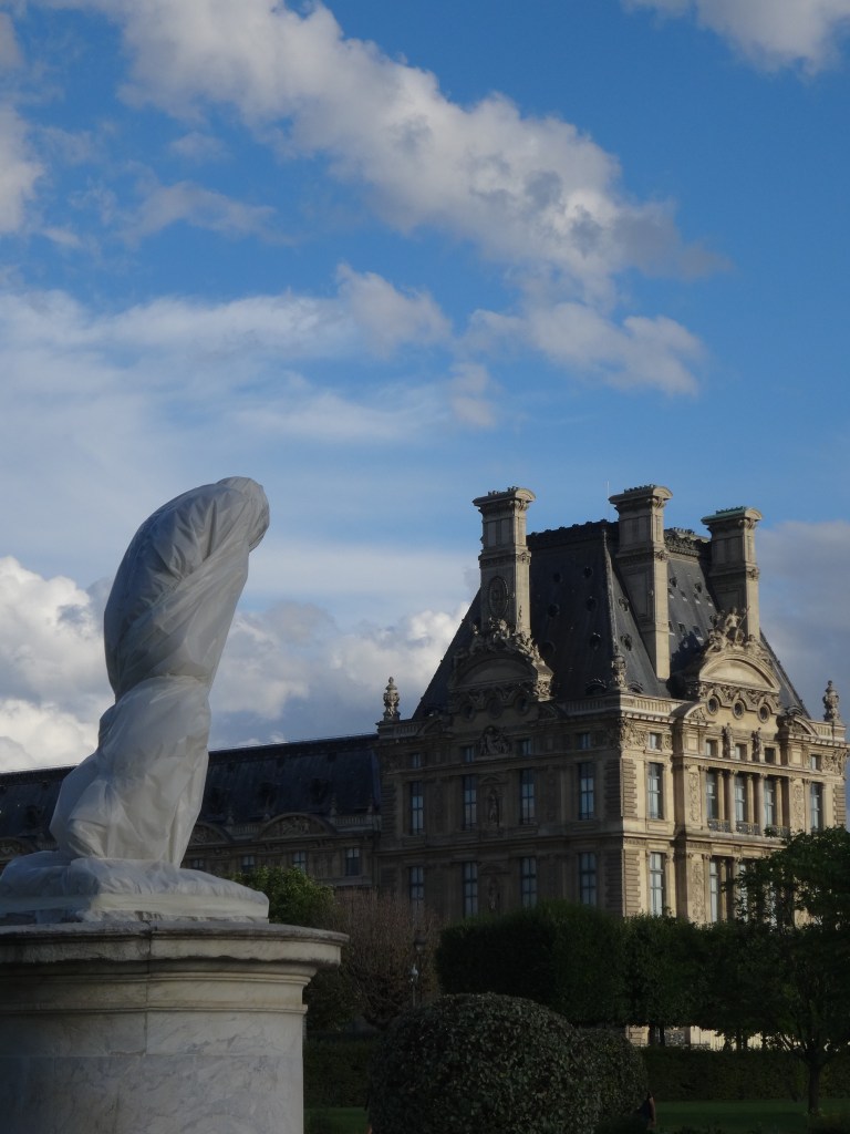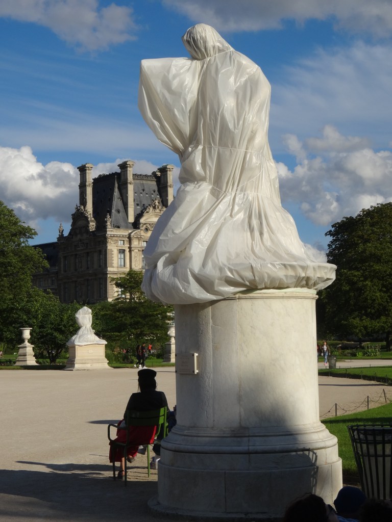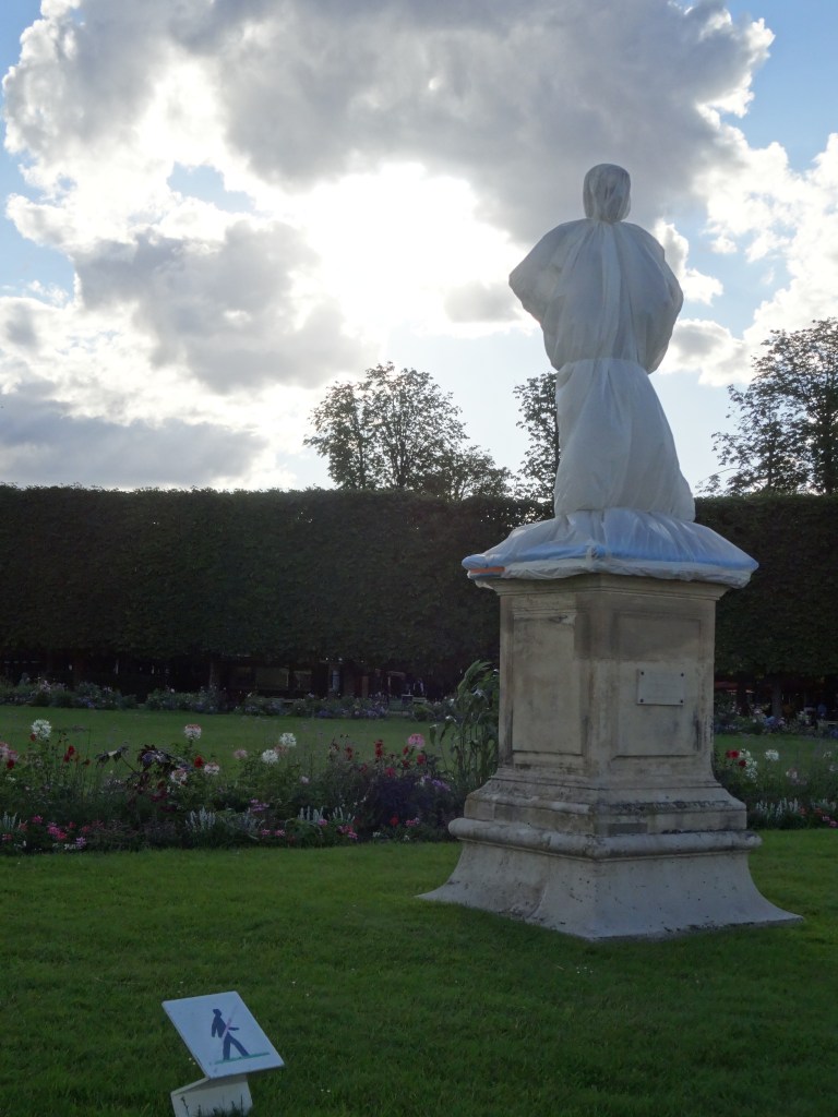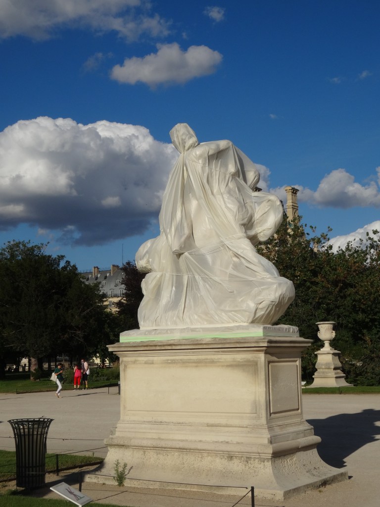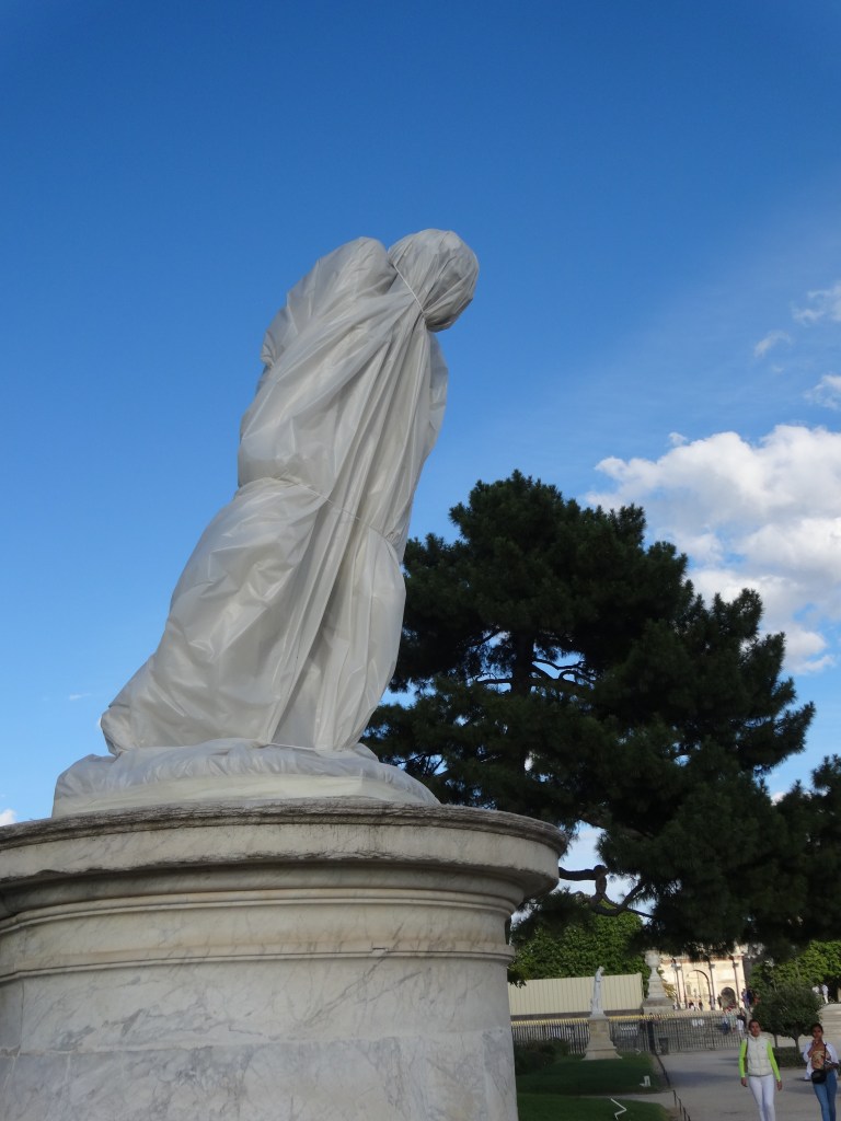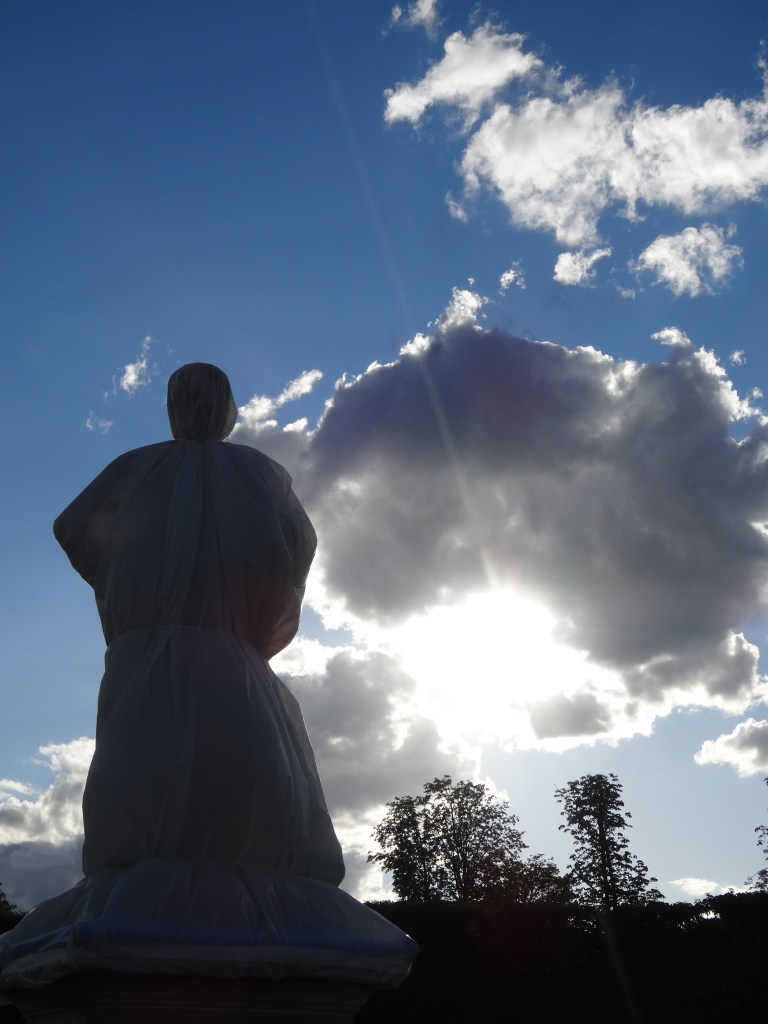 Dans le parc, à la tombée du jour, les statues, emballées malgré elles dans de grands voiles blancs, se morfondent d’être soustraites aux regards des passants (Paris, jardin des Tuileries, 2025)