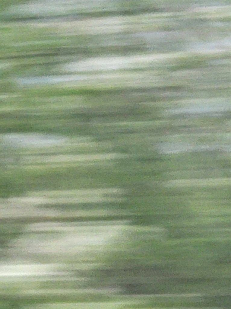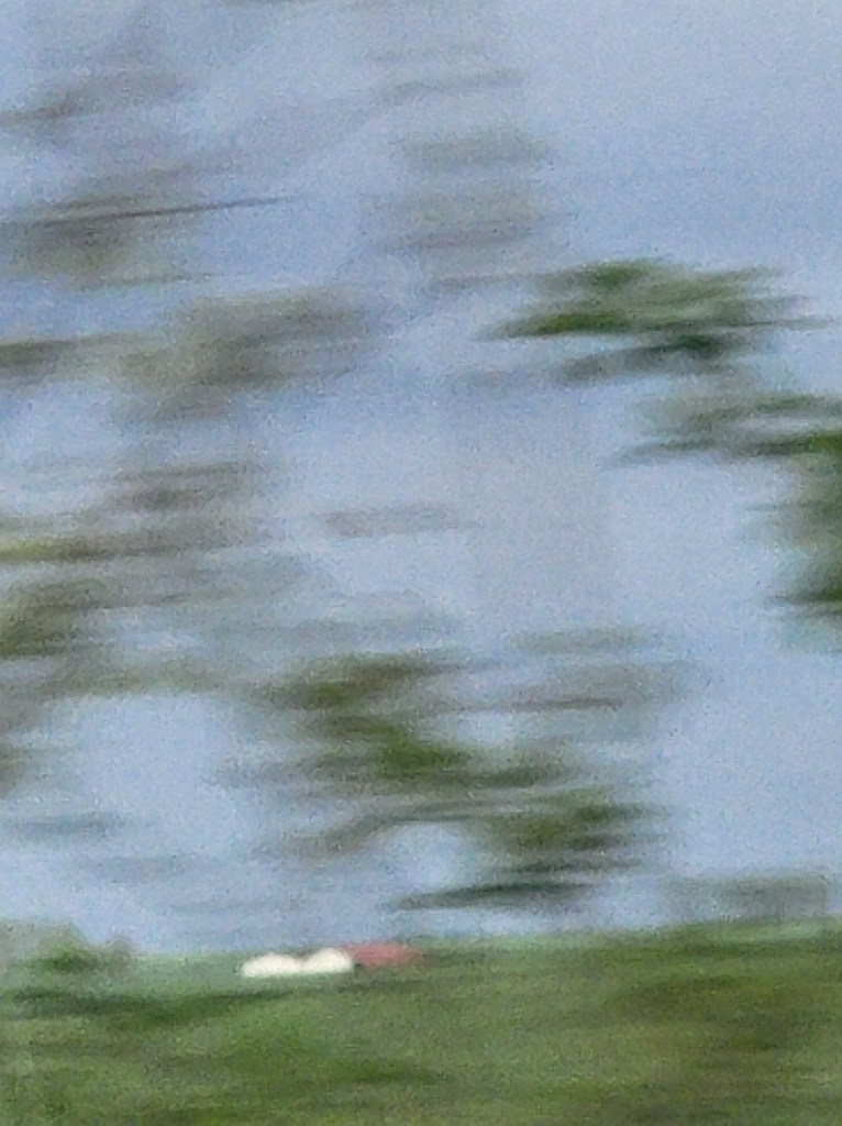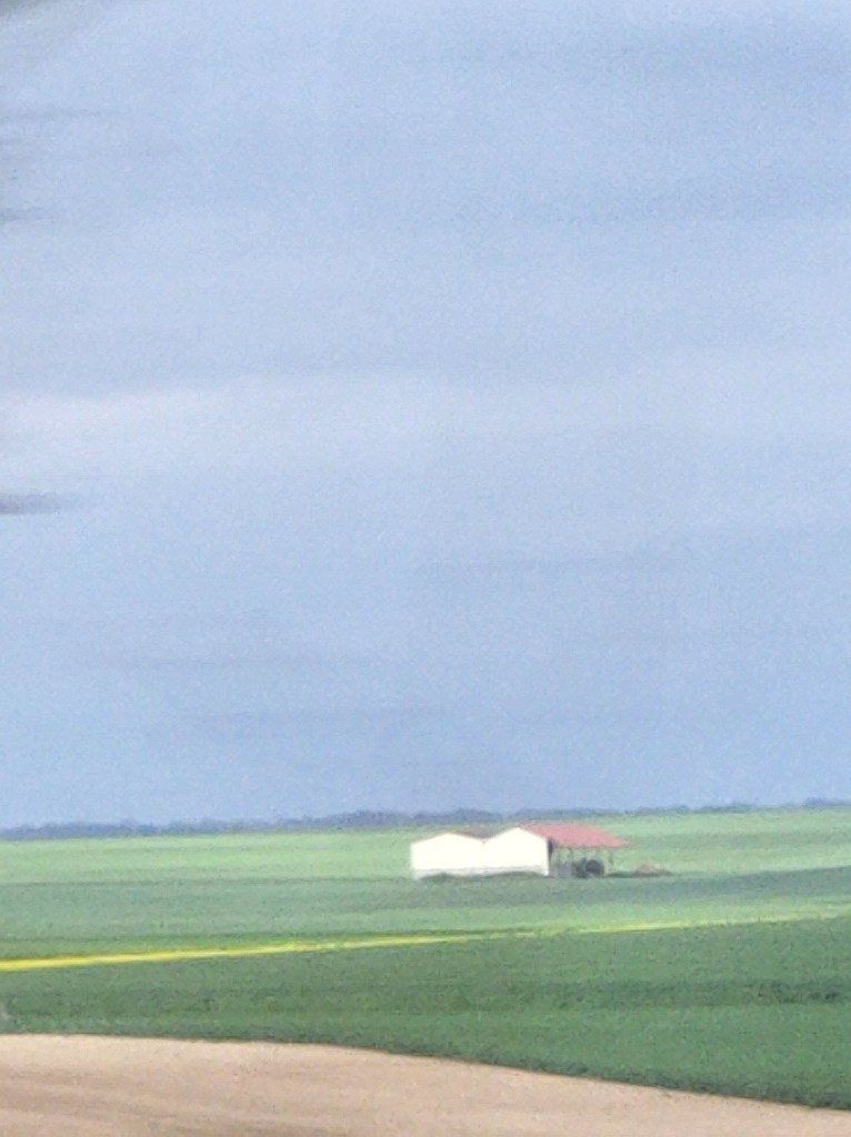 À la fenêtre, une habitation surgit au milieu de la campagne rase, puis disparaît, happée par la vitesse du train. (TER de Laon à Guignicourt)
